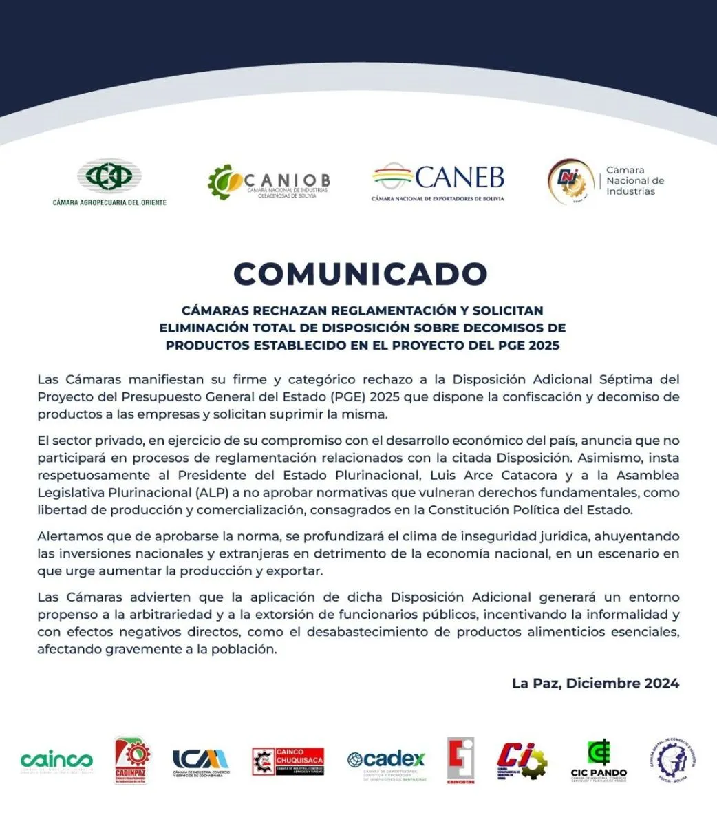 “El sector privado, en ejercicio de su compromiso con el desarrollo económico del país, anuncia que no participará en proceso de reglamentación relacionados con la citada disposición”, señala parte del comunicado difundido este miércoles.