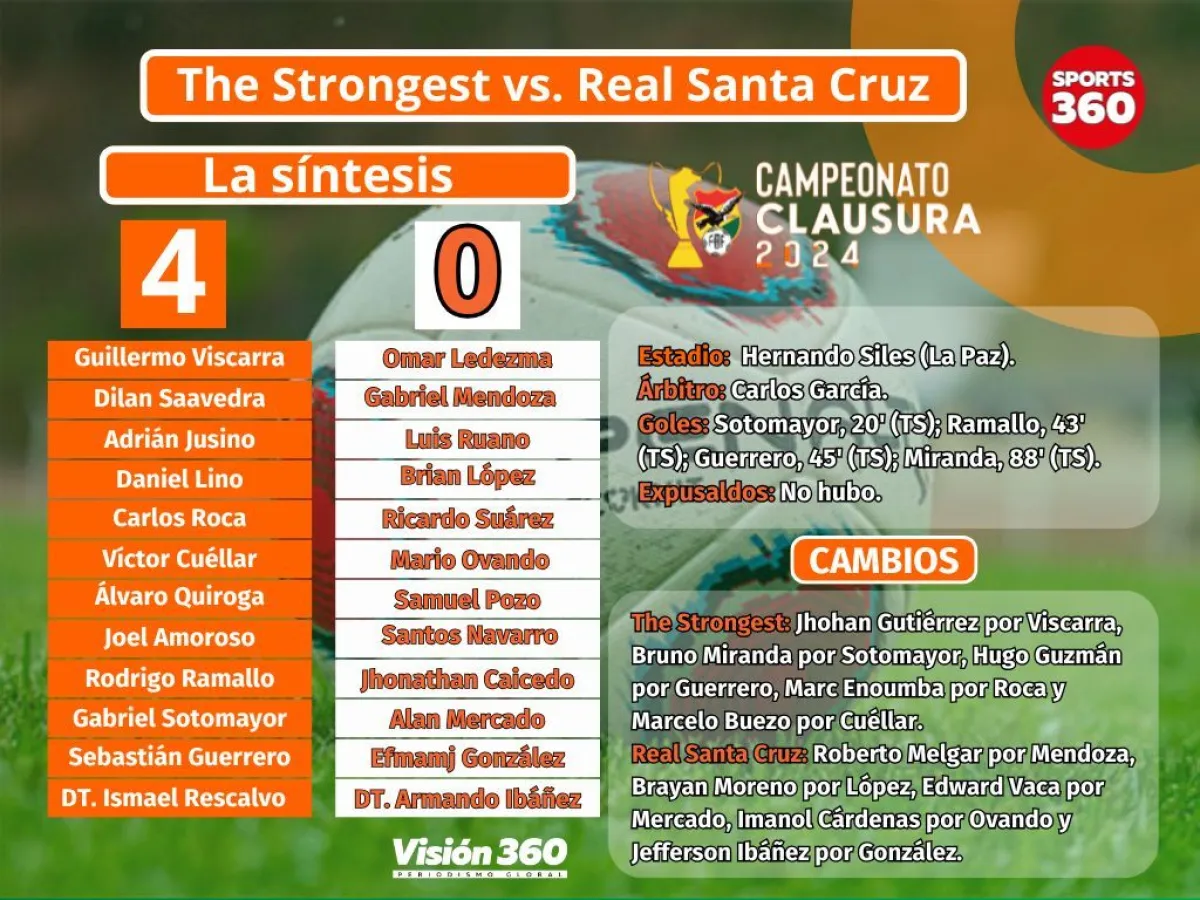 Con equipo alterno, además inédito, The Strongest goleó a Real Santa Cruz por 4 a 0, partido de la jornada 25 que se jugó en la noche de ese miércoles en el estadio Hernando Siles, y redujo a tres puntos la ventaja con Bolívar en la tabla de posiciones del torneo Clausura.