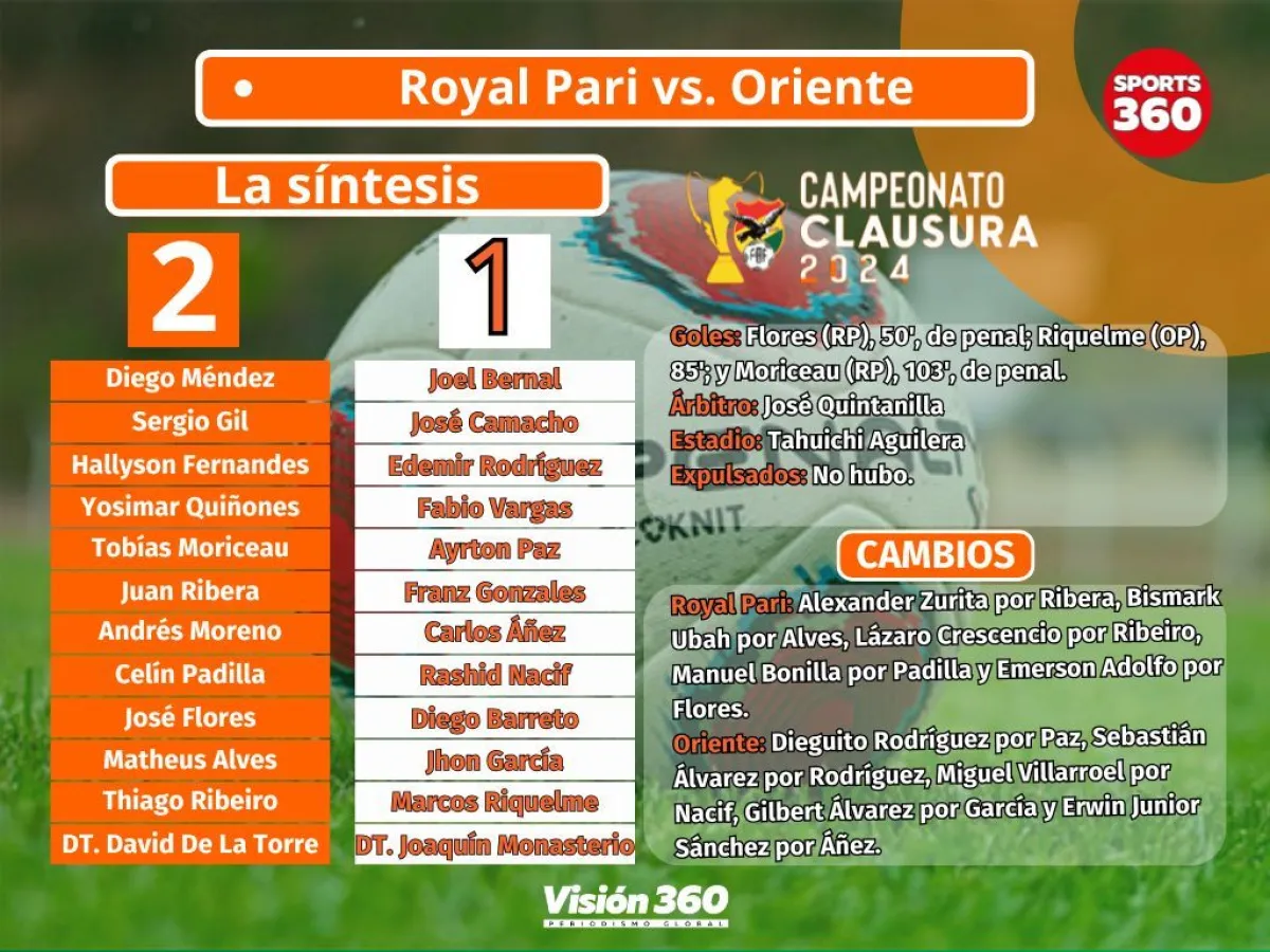 Con un gol de penal que causó una gran polémica y enfado en los jugadores de Oriente Petrolero, Royal Pari ganó 2-1 y sumó tres puntos vitales en su lucha por salir de la zona del descenso indirecto, este miércoles en el estadio Tahuichi Aguilera de Santa Cruz por la fecha 25 del torneo Clausura.