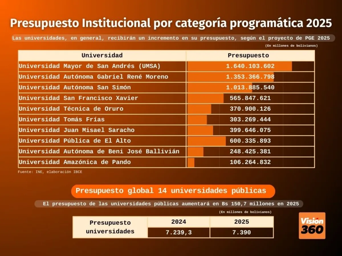 El presupuesto de las 14 universidades públicas del país subirá en 150,7 millones de bolivianos el próximo año a nivel general, según contempla el proyecto de Presupuesto General del Estado (PGE 2025).