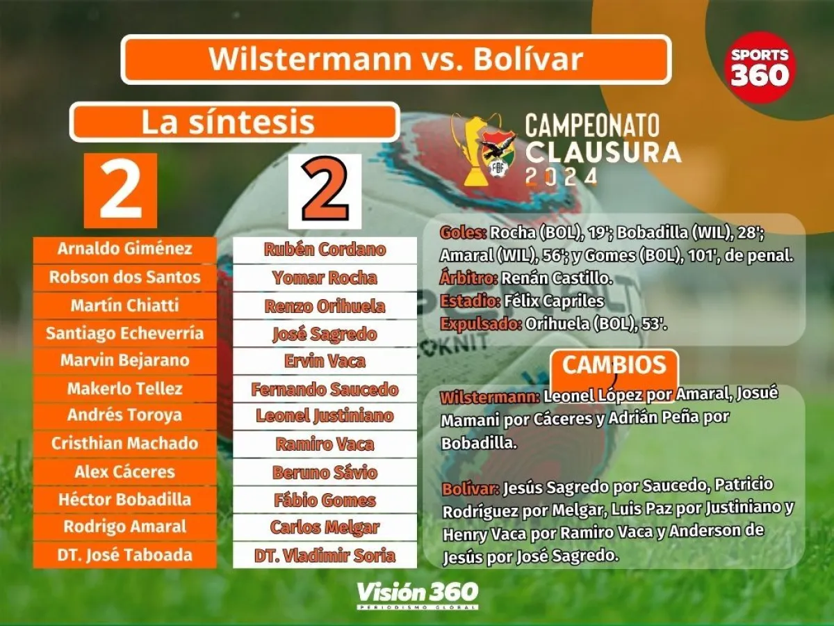 Ese tanto puso el 2-2 final, luego de que la Academia abriera el marcador con Yomar Rocha (19’) y de que Wilstermann le diera vuelta con Héctor Bobadilla (28’) y Rodrigo Amaral en el decimoprimer minuto de adición del primer tiempo (56’).