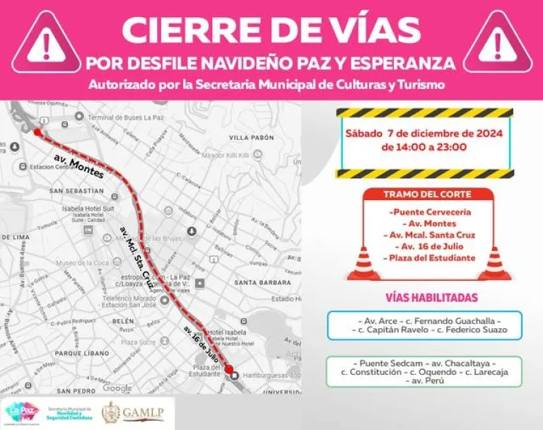 Este sábado, el Desfile navideño tomará todo el centro de La Paz. Empezará en la Cervecería, bajará por la Avenida Montes, la San Francisco, el Prado y terminará en la playa del Estudiante, de acuerdo a un informe de la Secretaría Municipal de Movilidad y Seguridad Ciudadana.
