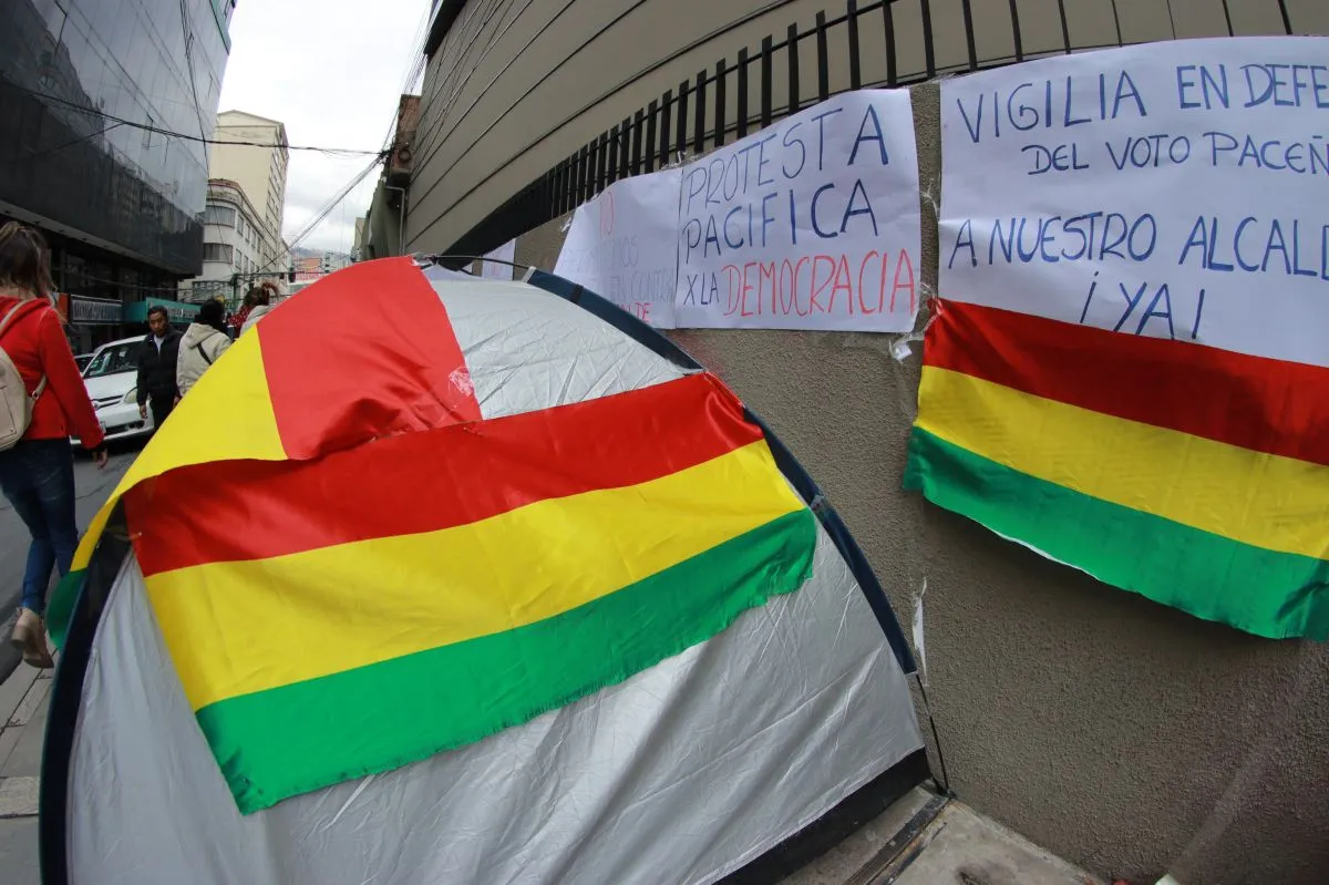 “Protesta pacífica por la democracia”, “No al golpe municipal”, “Vigilia en defensa del voto paceño” y “No permitiremos injusticia en contra de nuestro alcalde”, son algunos mensajes que se leen en las pancartas que los afines a Arias pegaron en la pared.