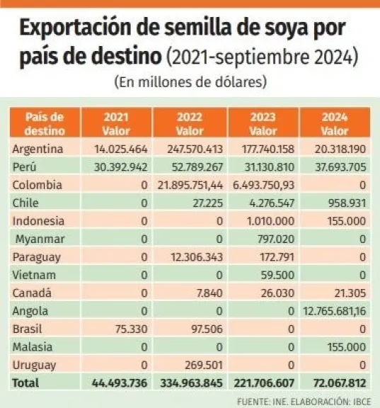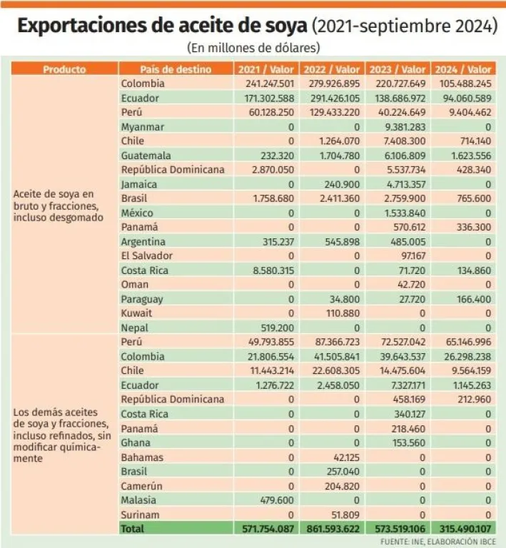 El Ibce estima una pérdida por la no exportación de soya y derivados hasta fin de año que supera los 650 millones de dólares. “Es algo preocupante por el golpe para el debilitado sector agrícola-agroindustrial; pero también para el país, porque no ingresará esa millonaria cantidad de divisas, justo cuando más la necesitamos”, lamentó Rodríguez.