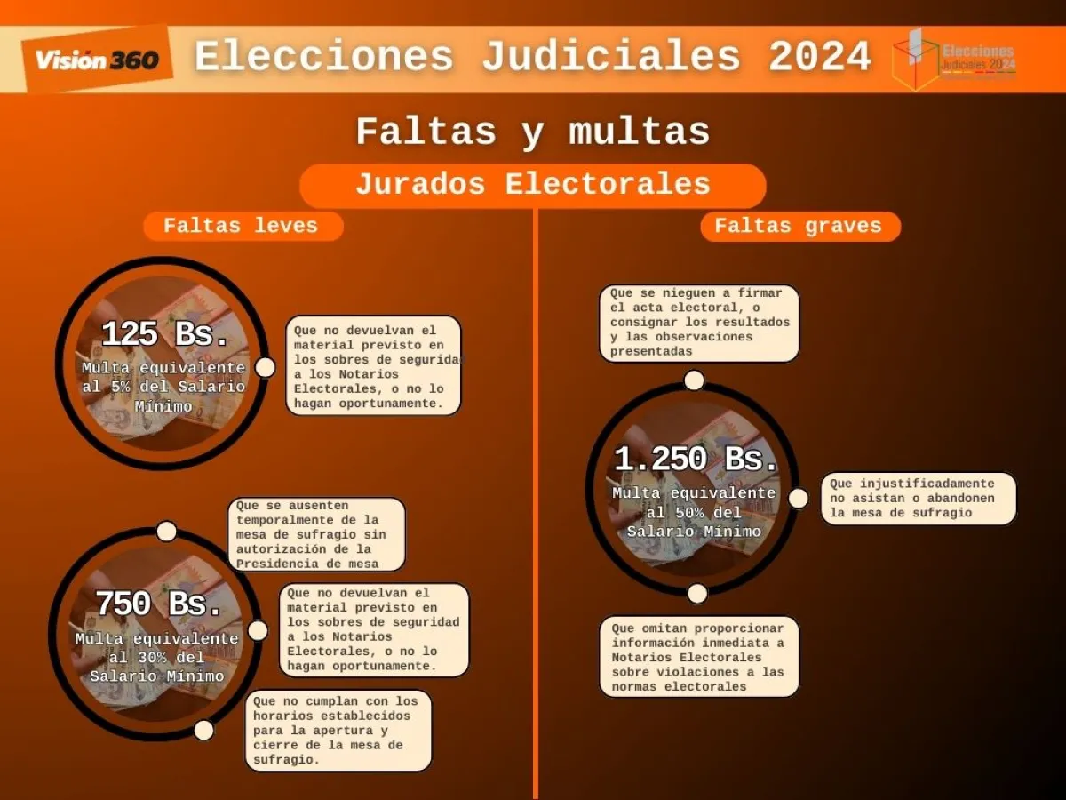 Las sanciones por faltas leves o graves, pueden  ir desde los 125 bolivianos, hasta 1.250. Por ejemplo, se considera falta desde el retraso en las acciones programadas para las elecciones, como la entrega de material, hasta el abandono de la mesa designada.