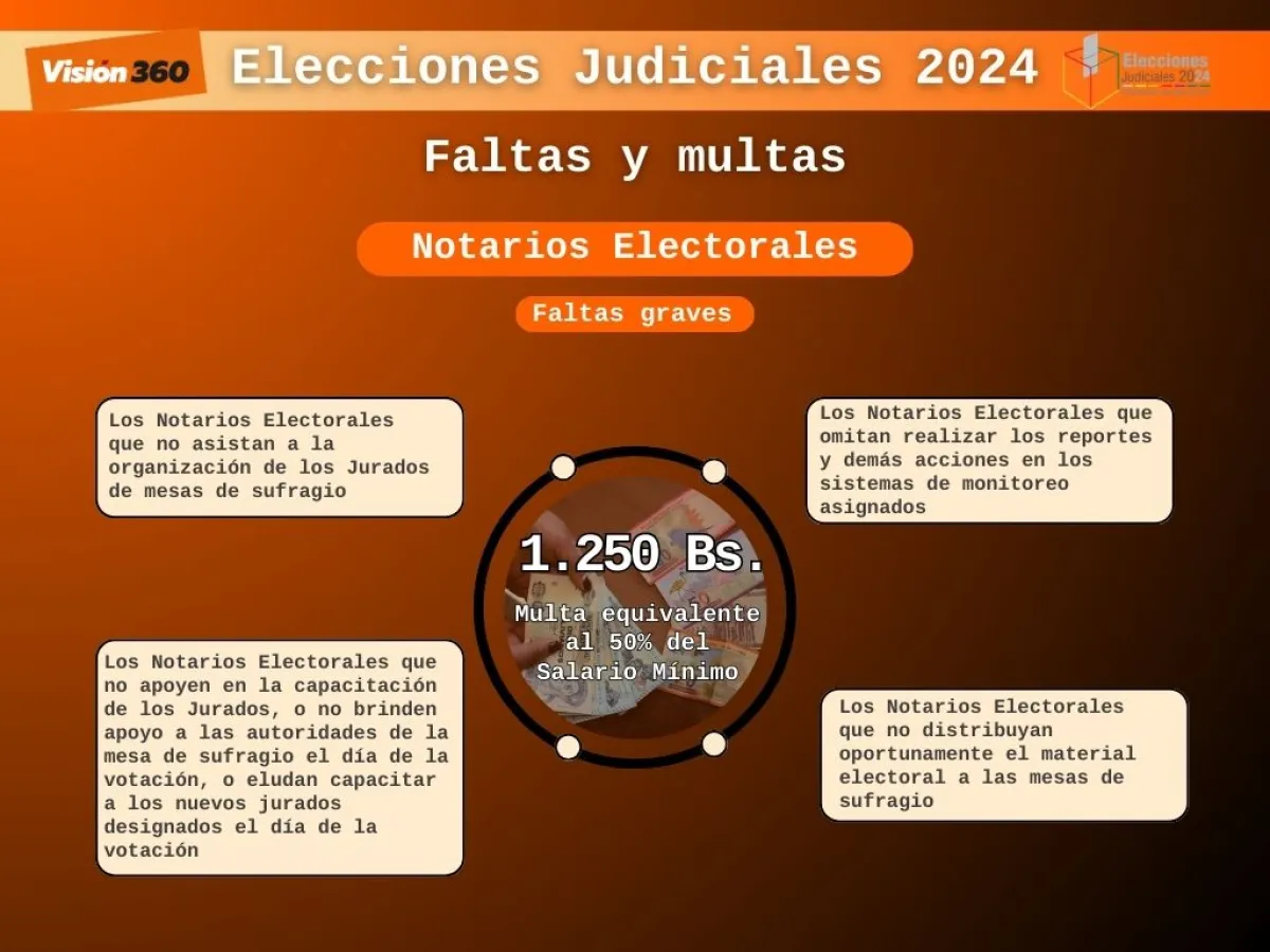 El Órganos Electoral Plurinacional (OEP) hizo públicas las sanciones que están establecidas para los notarios electorales que cometan faltas antes o después del día de las elecciones judiciales, relacionadas con el trabajo que se les asignó.