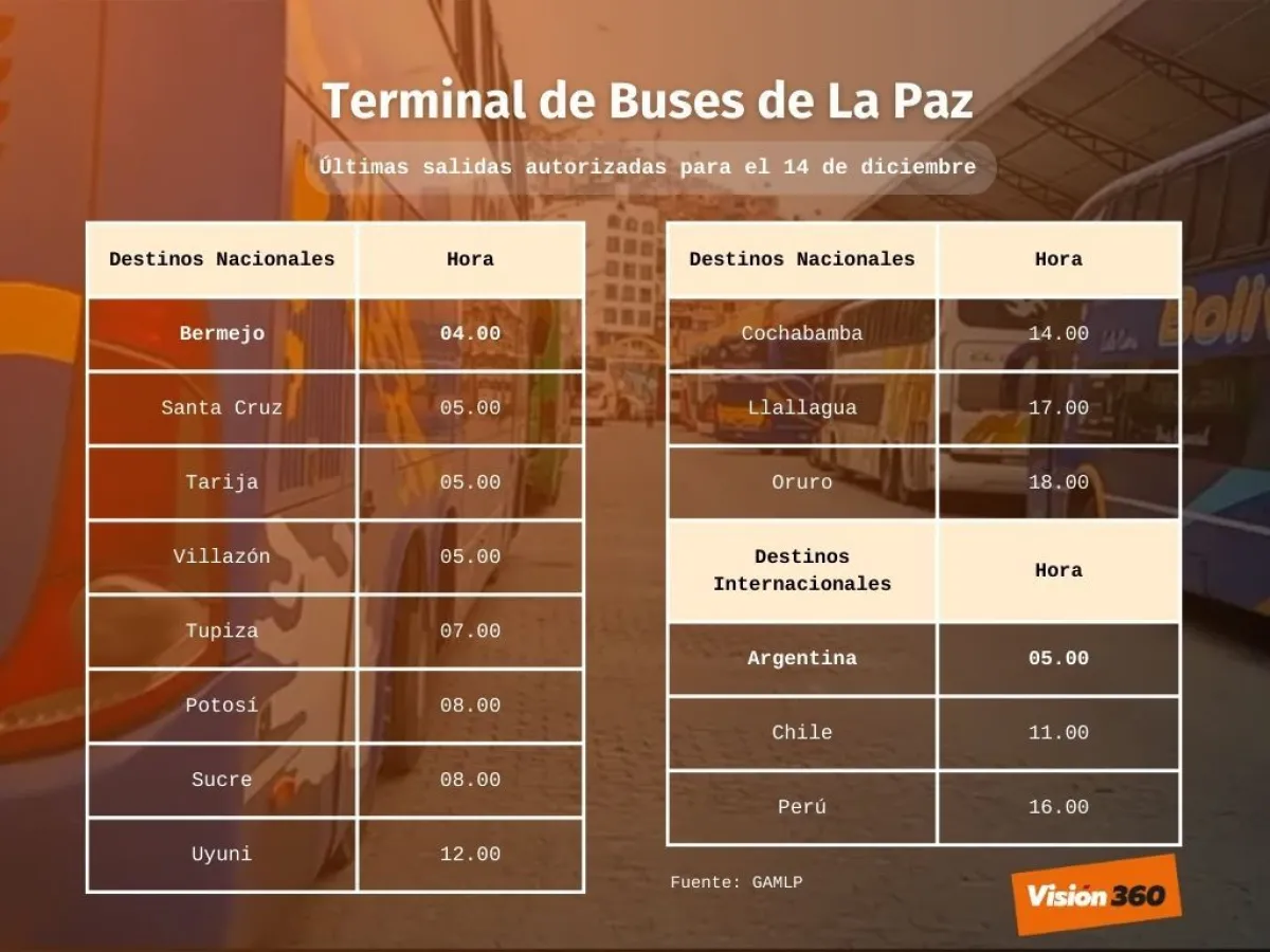 Mediante un comunicado, la Alcaldía paceña explicó que las salidas de buses estarán autorizadas este sábado. Según el cronograma, la última salida de las flotas será a las 18:00 con destino a Oruro.