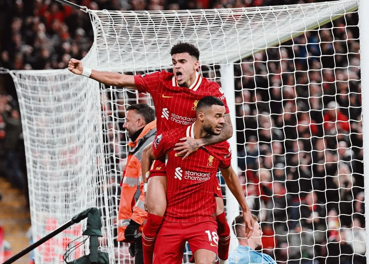 Gakpo (18) celebra su gol con Díaz. Foto: Liverpool FC.