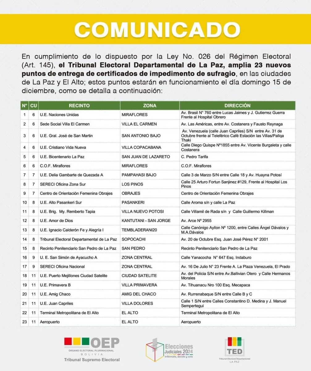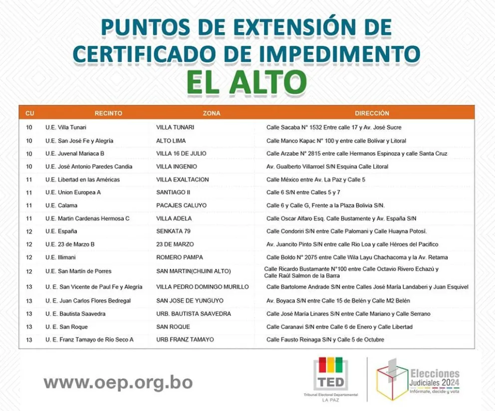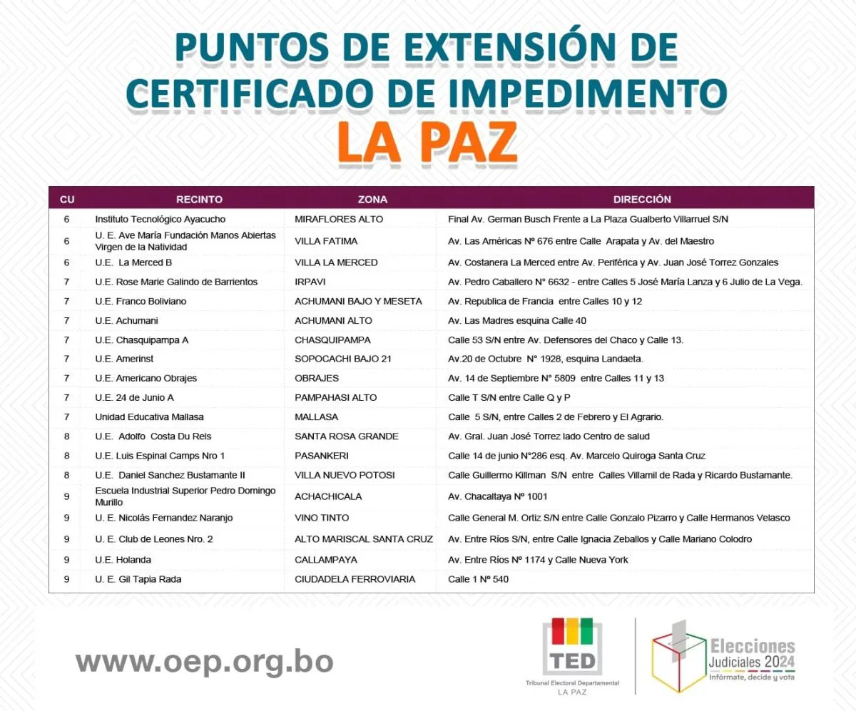 El Tribunal Departamental Electoral (TED) publicó este domingo los puntos donde los ciudadanos que no puedan emitir su voto, obtengan un certificado de impedimento en las ciudades de La Paz y El Alto, donde amplió a más de 20 los lugares donde se puede realizar el trámite.