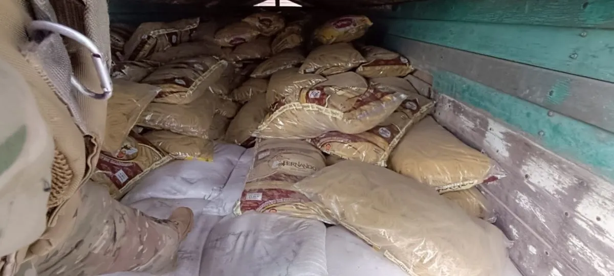 Azúcar y fideo de contrabando encontrados en otro de los camiones retenidos. Foto: Ministerio de Defensa.