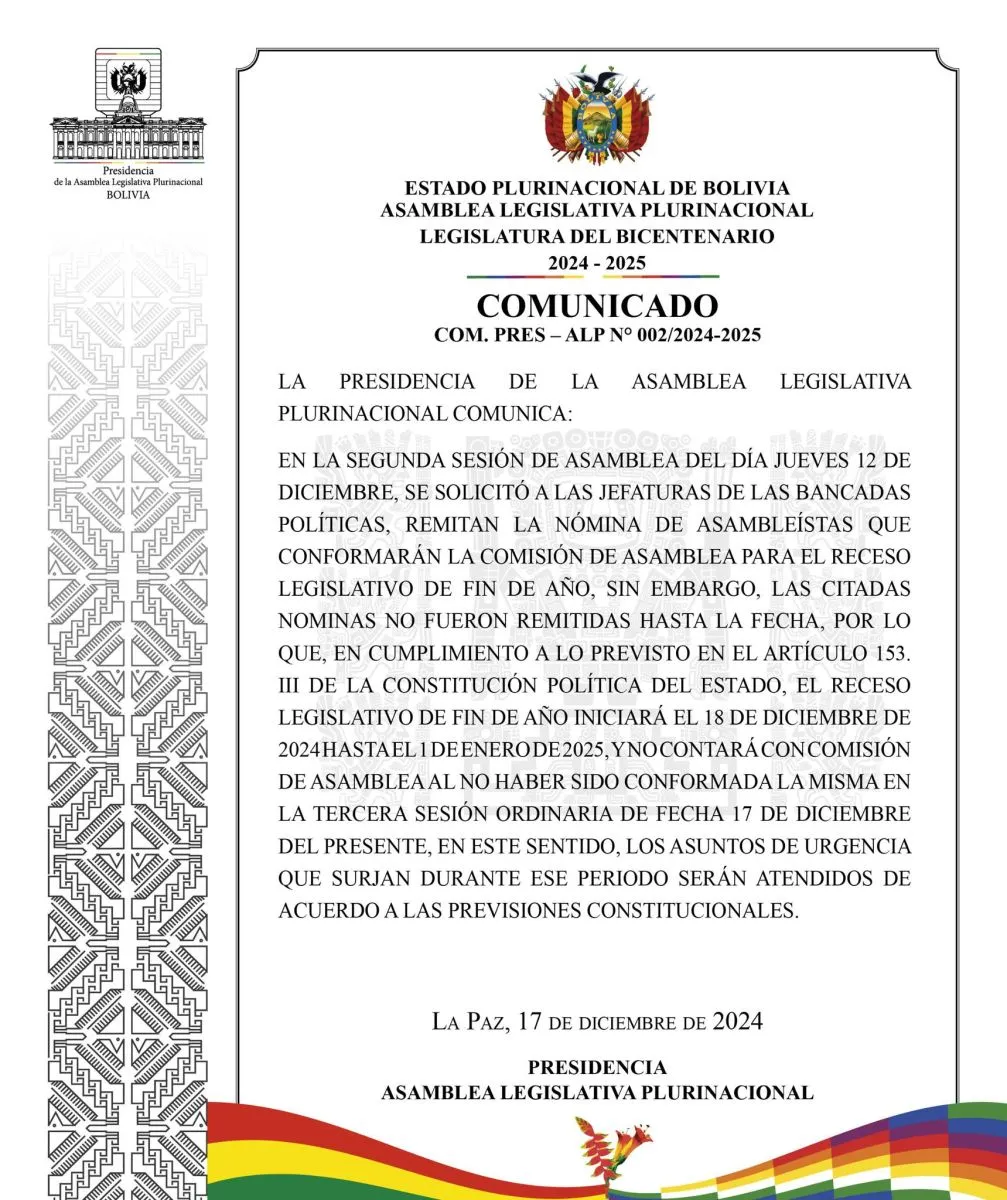 “Las citadas nóminas no fueron remitidas hasta la fecha, por lo que, en cumplimiento a lo previsto en el artículo 153 III de la Constitución Política del Estado, el receso legislativo de fin de año se iniciará desde el 18 de diciembre de 2024 hasta el 1 de enero de 2025”, se lee en un comunicado emitido por la Vicepresidencia del Estado.