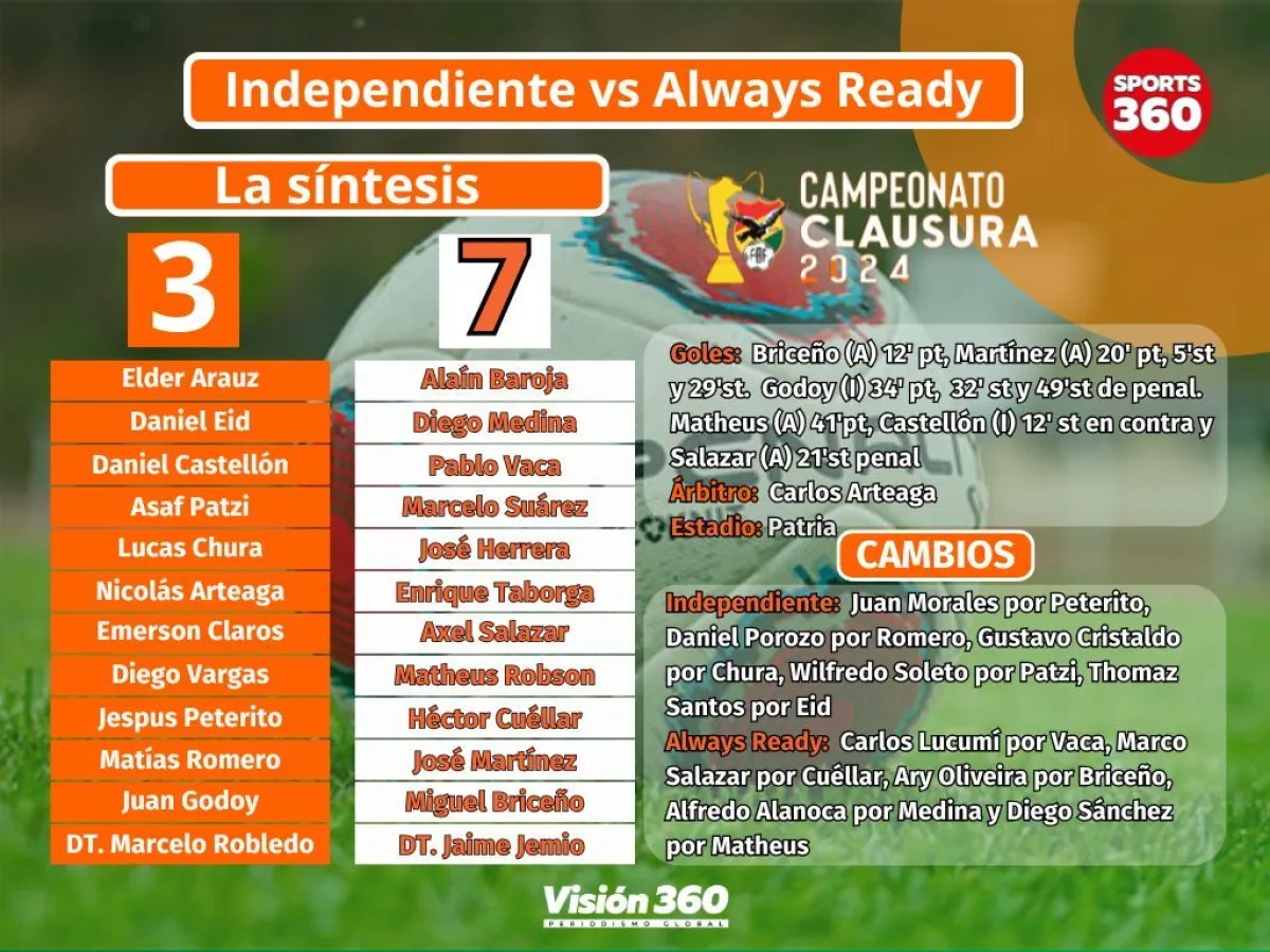 Always Ready no tuvo compasión de Independiente al que goleó por 7-3 en el estadio Patria de la Capital. Los capitalinos decidieron presentar un equipo de reserva tomando 3en cuenta que ya no tienen nada que hacer en el campeonato. El DT Marcelo Robledo dispuso que el golero Elder Arauz y el atacante Juan Godoy sean los únicos habituales titulares en su conformación.