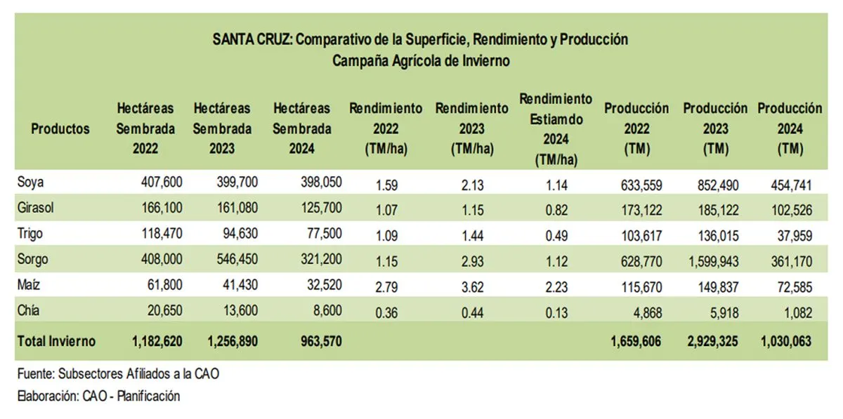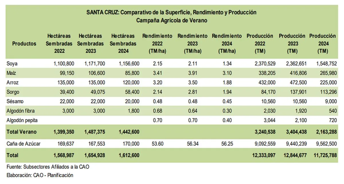La producción agrícola de Santa Cruz con sus diferentes cultivos de alimentos disminuyó de 17,33 millones de toneladas, en 2023, a 14,37 en 2014, un 17,07% menos, debido al impacto negativo de la sequía y la falta de diésel, informó la Cámara Agropecuaria del Oriente (CAO).