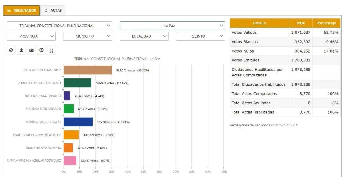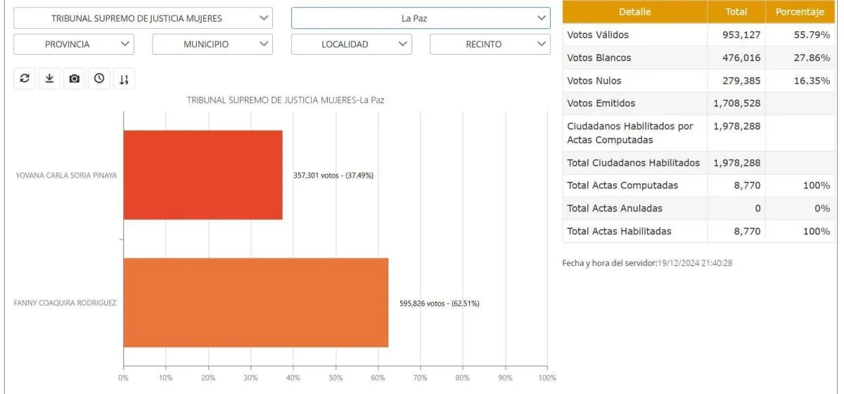 En tanto, Fanny Coaquira Rodríguez, con el 62,51% (595.826 votos), ganó la elección como magistrada titular del Tribunal Supremo de Justicia (TSJ), por el departamento de La Paz.