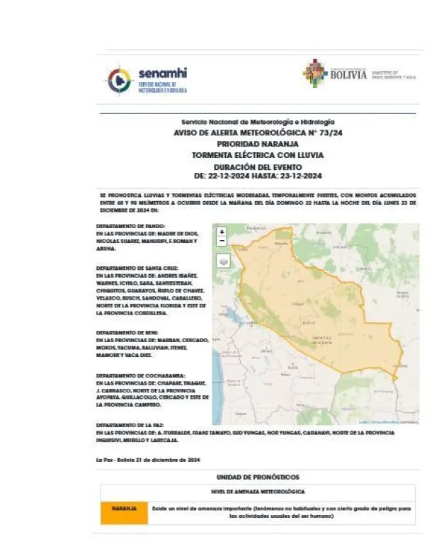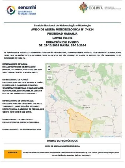 “Existen alertas de prioridad naranja, una que es desde esta noche (sábado 21) hasta el día de mañana, que estaría afectando los departamentos de Tarija, Chuquisaca Potosí y Santa Cruz, con lluvias temporalmente fuertes y tormentas eléctricas”, dijo la meteoróloga Marisol Portugal a Cadena A.