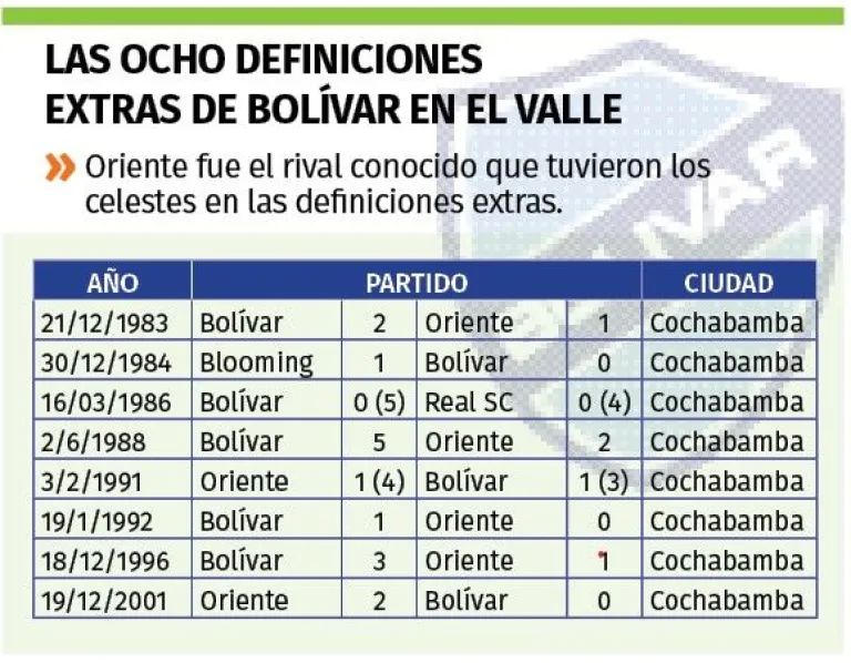 San Antonio será el cuarto rival que tengan los celestes en Cochabamba, donde han conseguido cinco títulos en las definiciones extras que les tocó disputar en su historia.