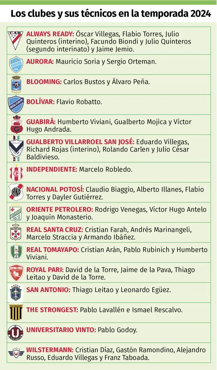Always Ready y Wilstermann, dos que se quedaron sin cumplir sus objetivos en la temporada, tuvieron cinco técnicos en el año. La banda roja tuvo a Óscar Villegas, Flabio Torres, Facundo Biondi y Jaime Jemio. En medio hubo dos interinatos de Julio Quinteros.