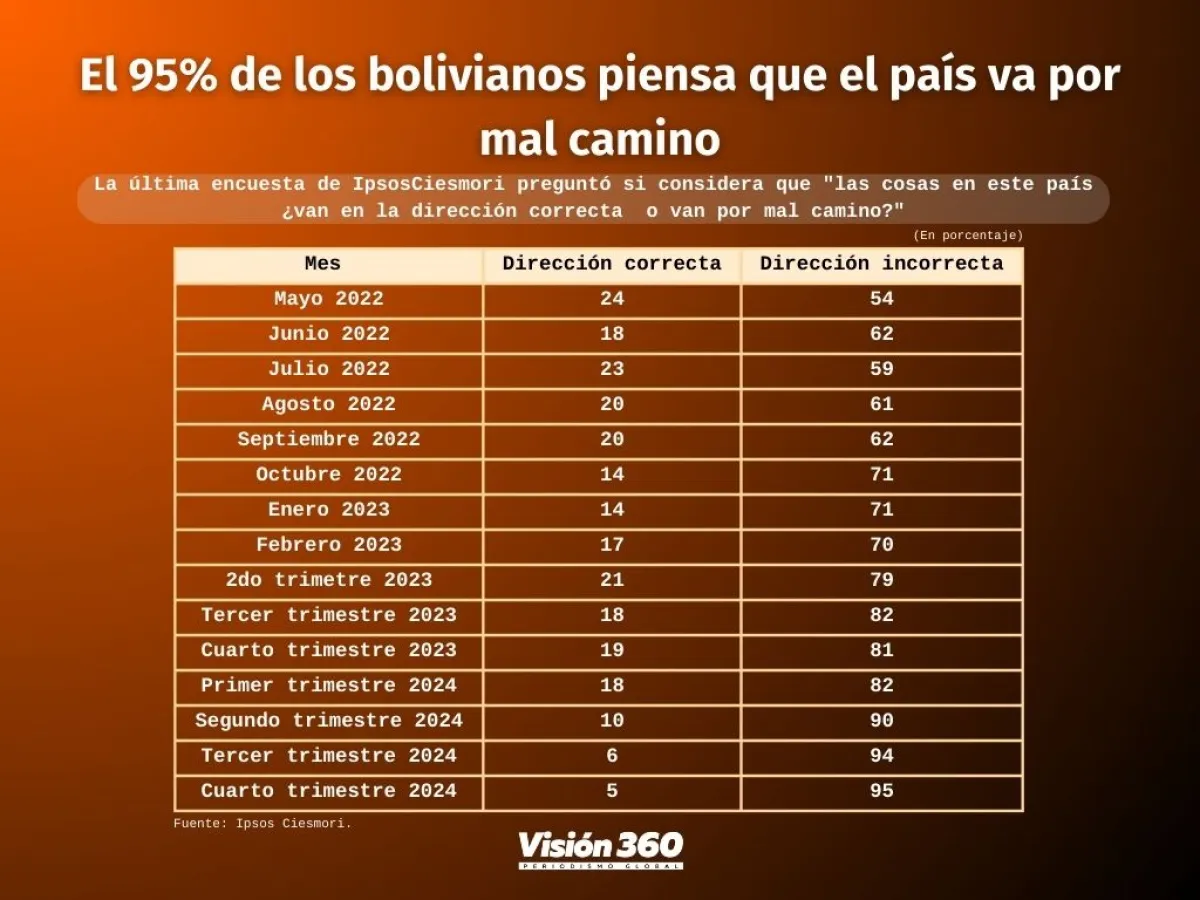En el primer trimestre de 2024, un 82% ya sentía que el país va por mal camino, el segundo trimestre el porcentaje subió a 90% y en el tercer trimestre a 95%, mientras que solo un 5% consideraba que el país va por la senda correcta.