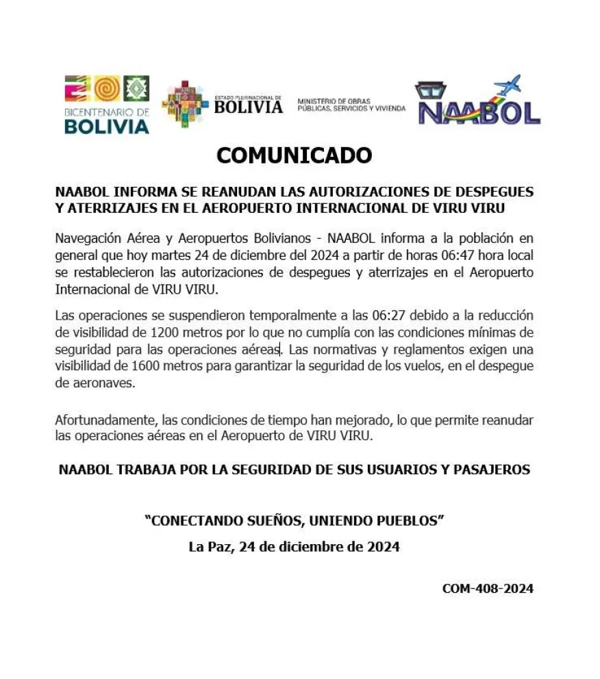 “Afortunadamente, las condiciones de tiempo han mejorado, lo que permite reanudar las operaciones aéreas en el Aeropuerto de Viru Viru”, se lee en el pronunciamiento.