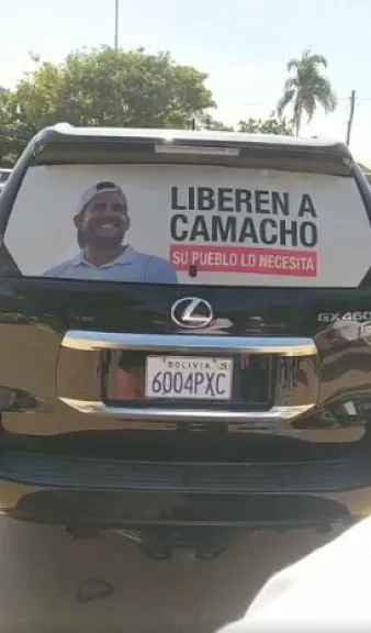 “Secuestrado por el poder y la opresión”, se podía escuchar en una canción que sonaba con megáfonos durante el trayecto hacia Santa Cruz. “Libertad para Camacho, nuestro guerrero”, decía otra parte de la letra.