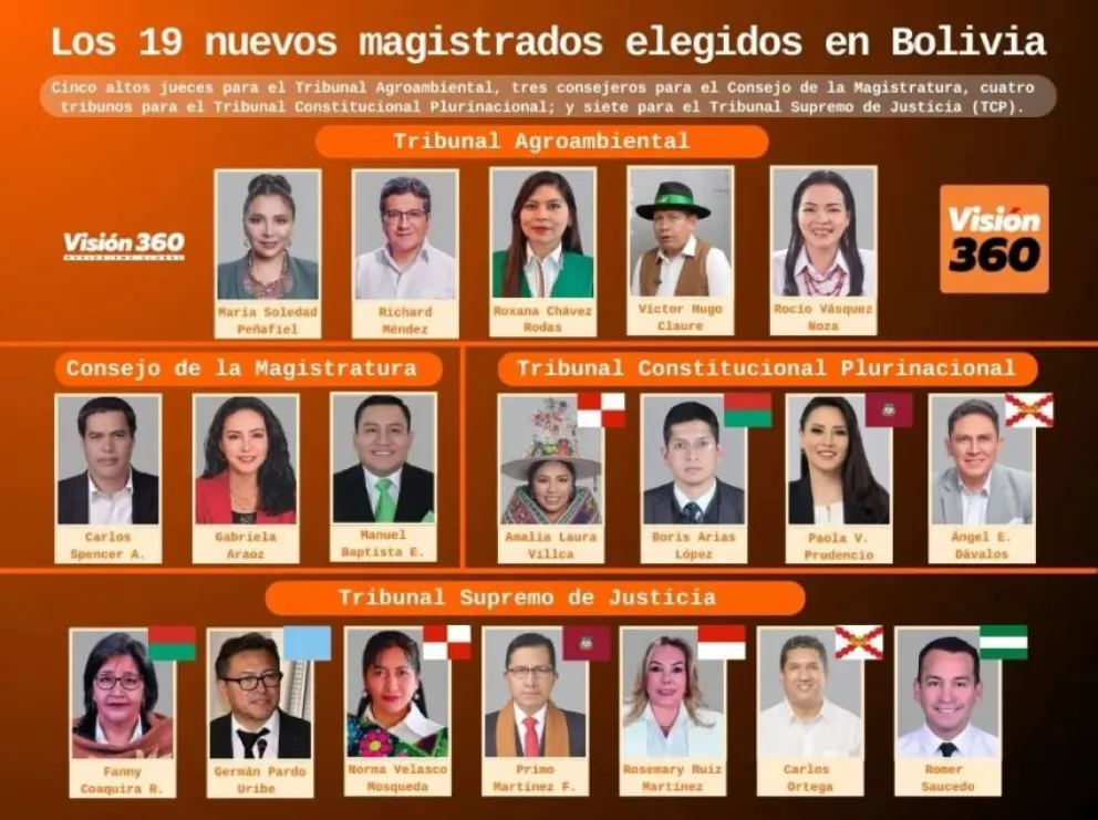 El viernes pasado, el TSE presentó el cómputo final de las elecciones judiciales del 15 de diciembre y proclamó a los nuevos jueces, cinco nuevos para el Tribunal Agroambiental, tres del Consejo de la Magistratura, cuatro para el TCP y siete del TSJ.