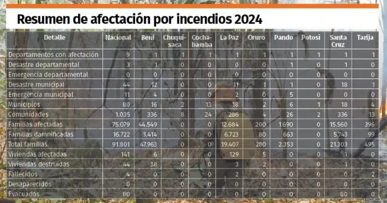 Hasta el 8 de octubre, según un informe del  Instituto Nacional de Reforma Agraria (Inra), el fuego consumió 9,8 millones de hectáreas en el territorio nacional, cifra que supera a los 6,3 millones de hectáreas consumidas por las llamas en 2023 y duplica el daño que se verificó en 2019 cuando 5,2 millones de hectáreas fueron afectadas por los incendios. Únicamente en 2010 el país soportó otra ola incendiaria que superó los nueve millones de hectáreas consumidas, ese año la cifra llegó a 9,3 millones.