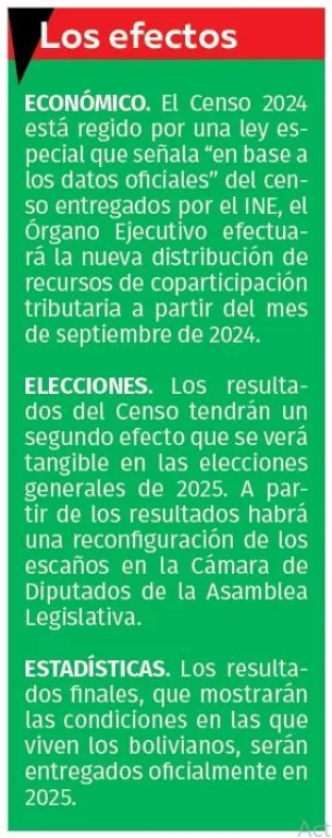 En un cálculo político, antes del Censo, diferentes regiones calculaban su participación en la Asamblea Legislativa, tras las elecciones de 2025, con base en las proyecciones.  Santa Cruz estimaba ganar tres escaños. Sin embargo, de acuerdo con los datos de población del Censo 2024 y con el método establecido en la  Ley 026 de Régimen Electoral, usado para las tres últimas elecciones generales, apenas podría ganar uno.