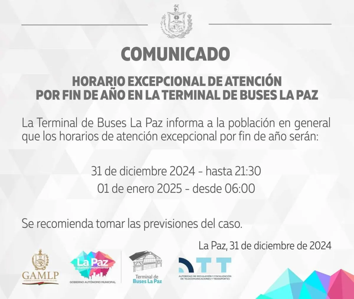 La Terminal de Buses de La Paz informó este martes que aplicará horarios excepcionales por las fiestas de Fin de Año. Este martes 31 de diciembre, la terminal operará hasta las 21.30 y mañana miércoles 1 de enero, feriado, abrirá sus puertas desde las 6.00. En un comunicado, la Terminal recomendó a los usuarios tomar las previsiones del caso.
