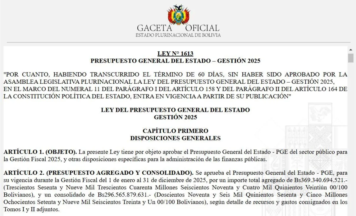 Esta jornada, 1 de enero, la Gaceta Oficial de Bolivia publicó la Ley 1613 del PGE 2025. “Por cuanto, habiendo transcurrido el término de 60 días, sin haber sido aprobado por la Asamblea Legislativa Plurinacional la Ley del Presupuesto General del Estado – gestión 2025, en el marco del numeral 11 del parágrafo i del artículo 158 y del parágrafo ii del artículo 164 de la Constitución Política del Estado, entra en vigencia a partir de su publicación", señala la parte que antecede al desarrollo del presupuesto.