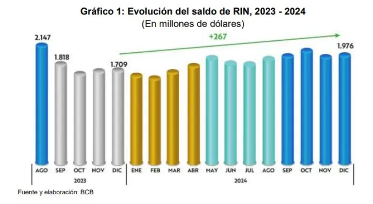 Bolivia cerró 2024 con un nivel de Reservas Internacionales Netas (RIN) de 1.976 millones de dólares. El monto es superior en 267 millones de dólares al stock que se tenía en 2023.
