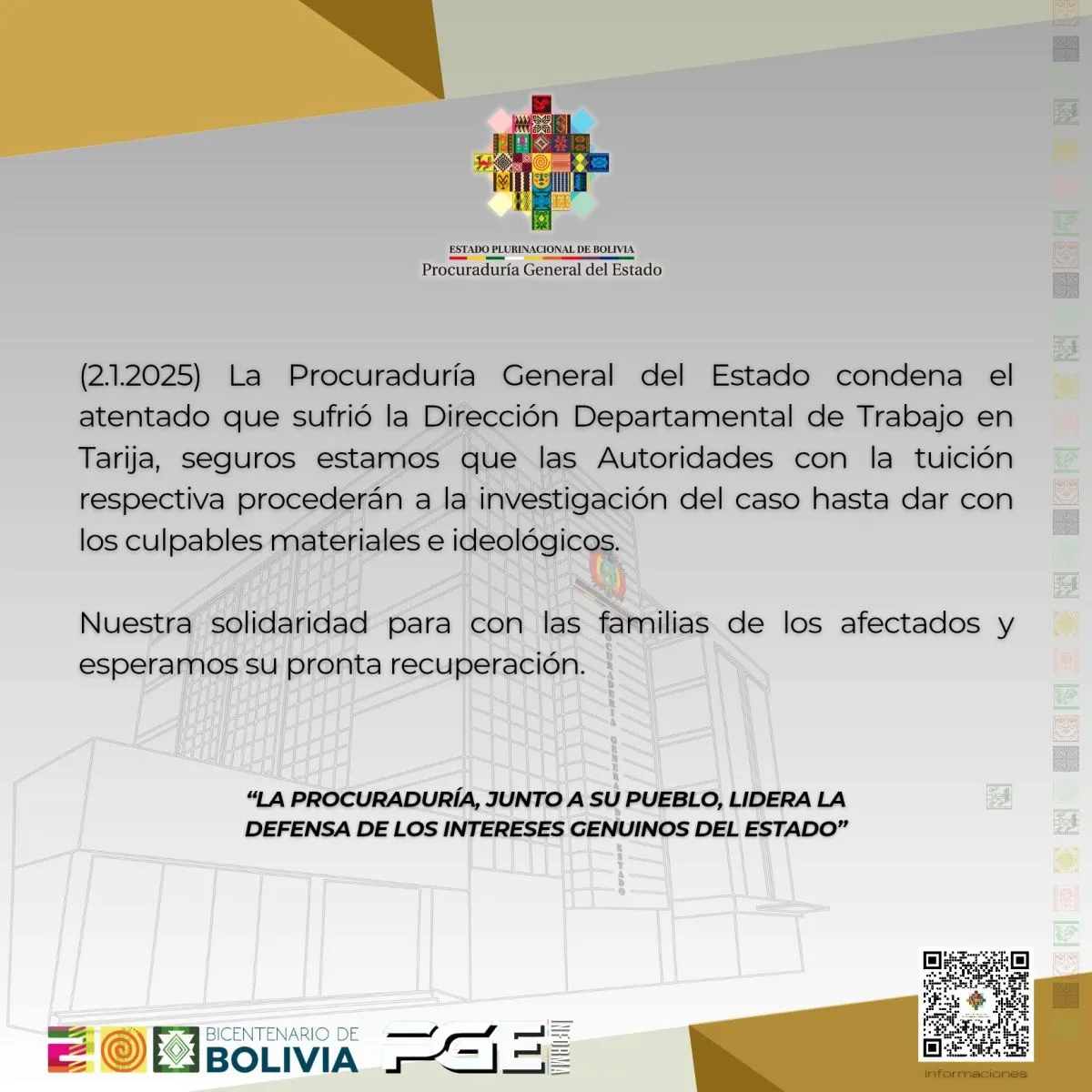 Mientras que la Procuraduría General del Estado (PGE), mediante un comunicado público, calificó el hecho de un “atentado” y expresó su condena.