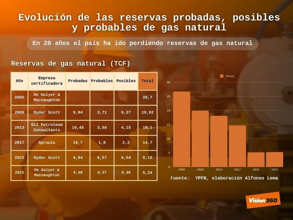 Para 2005 la empresa que realizó la última certificación a 2023, DeGolyer and MacNaughton Corp, había cuantificado las reservas del país en 26,7 TCF, pero las exautoridades del Gobierno de Evo Morales cuestionaron los datos porque en su momento se argumentó que las petroleras habían inflado las reservas para mostrar resultados en los mercados financieros.