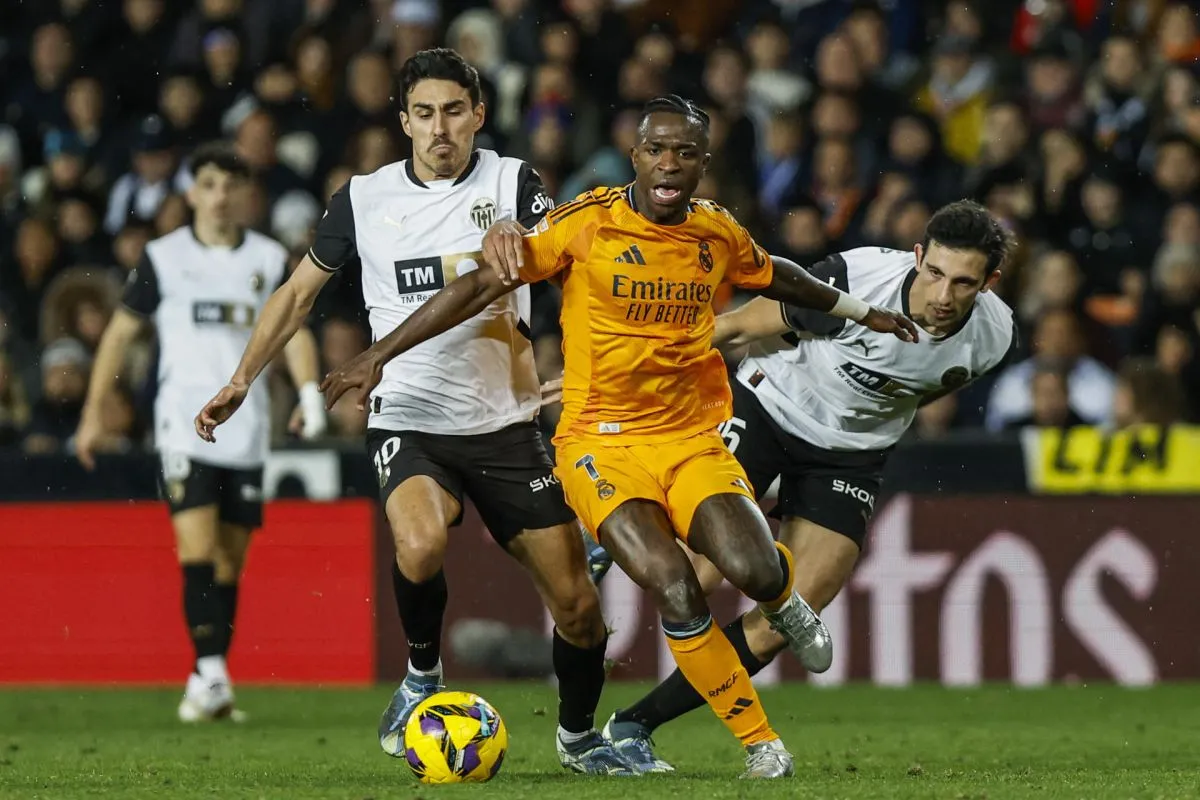 Sobre el césped, Carlos Corberán, que se estrenaba como técnico del Valencia, puso a tres centrales para hacer frente a un Real Madrid al que volvía Vinícius tras la sanción y que necesitaba una victoria para ser líder en solitario. O escalar en el descenso para los blanquinegros, o coronar la clasificación para los blancos. Esas eran las dos opciones.
