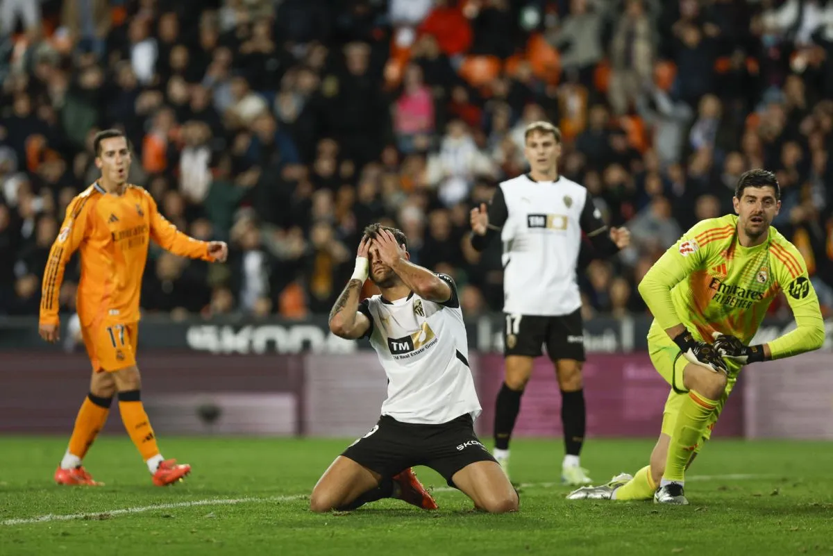 El Valencia volvió a la carga y en el minuto 27 llegó el estallido de Mestalla. Courtois se hizo gigante con un paradón a Javi Guerra, pero la pelota quedó suelta y Hugo Duro la empujó a la red. El equipo de Corberán necesitó menos ocasiones que su rival para adelantarse y aguantó con un gran Dimitrievski que frenó con el pie un tiro de Vinícius, a quien Mestalla le cantó “balón de playa”, antes del descanso.