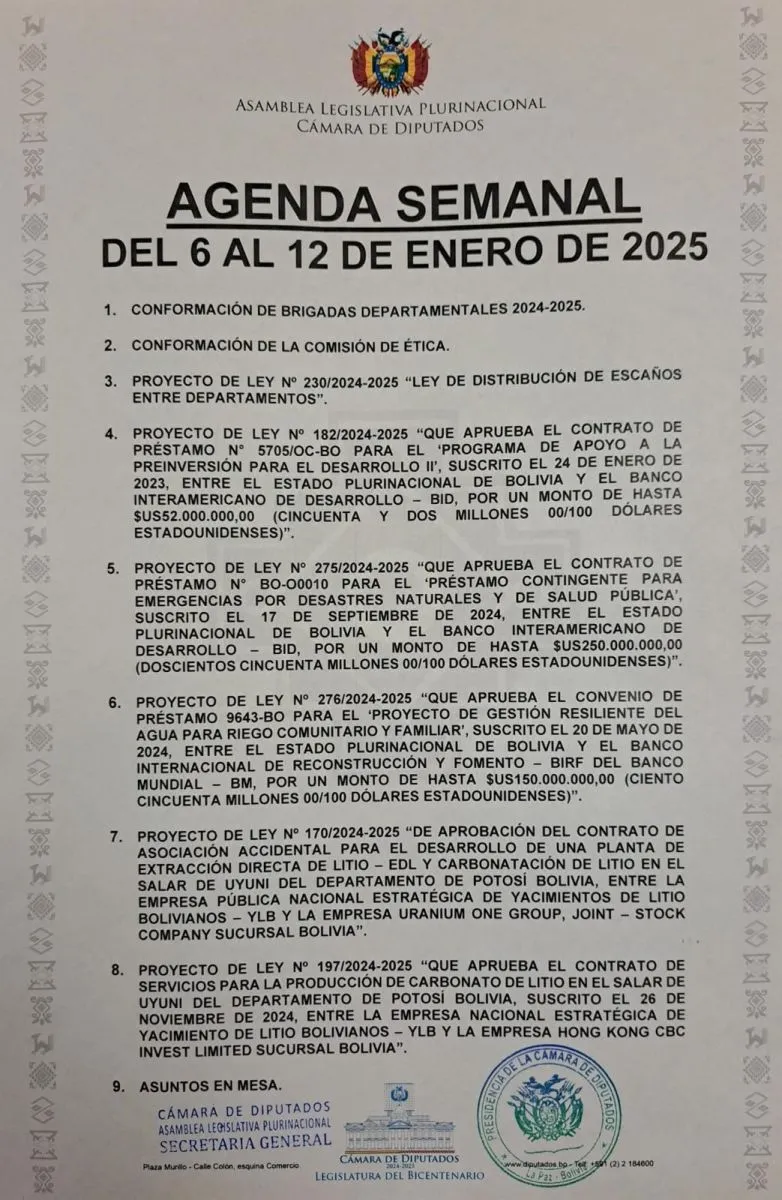 Entre otras tareas pendientes que tiene la ALP se encuentran, por ejemplo, la convocatoria a elecciones judiciales, para completar los cargos que faltan en cinco departamentos, créditos internacionales por un monto de $us 1.228.340.000 destinados a obras de infraestructura y de prevención ante los efectos climáticos.