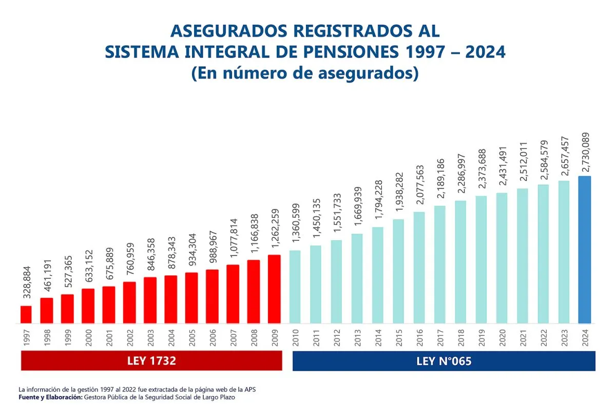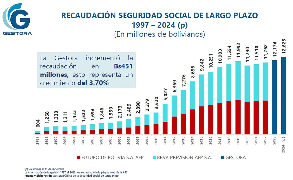 La recaudación de aportes para la vejez de los trabajadores activos aumentó en 451 millones de bolivianos, que representa un crecimiento de 3,70% y, en total, alcanza a 12.625 millones de bolivianos.