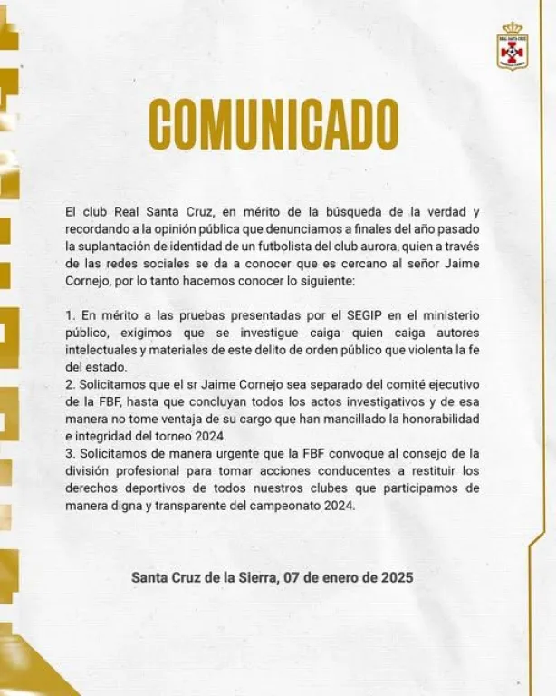 Real Santa Cruz se agarra de este informe y plantea que el titular de Aurora, Jaime Cornejo, “sea separado del comité ejecutivo de la FBF hasta que concluyan todos los actos investigativos y de esa manera no tome ventaja de su cargo.
