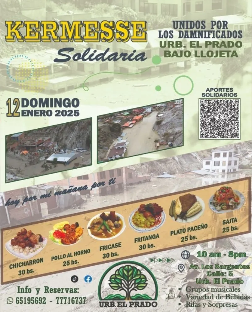 Los vecinos de Bajo Llojeta, donde una mazamorra afectó a unas 40 casas, realizarán este domingo una kermesse para recaudar fondos que les permitan pagar la maquinaria que necesitan para seguir sacando el barro que aún queda en el sector, y para muchas otras necesidades que tienen quienes aún permanecen desplazados.