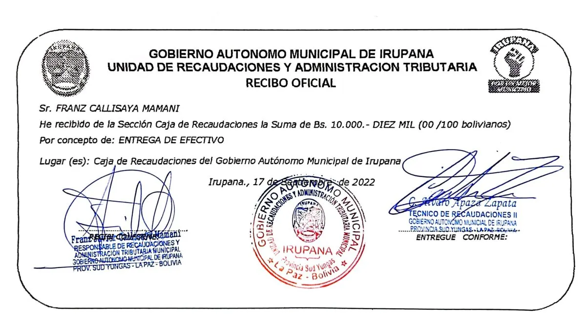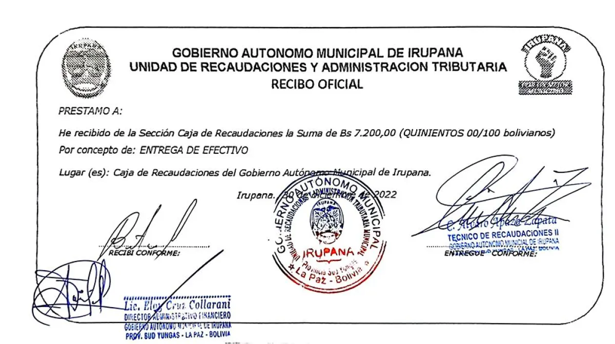 No obstante, además de sus afirmaciones, Apaza, presentó 45 recibos para comprobar que la entrega de este dinero se dio por órdenes de Mamani. Precisamente, varios de los recibos llevan las firmas de Callisaya y Cruz, pero también del alcalde de Irupana.