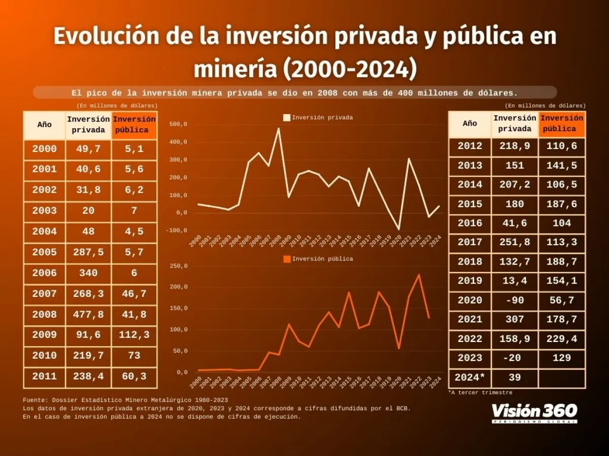 La inversión extranjera directa o privada en la minería boliviana tuvo un pico de 477,8 millones de dólares en 2008 y luego declinó hasta registrar flujos negativos, sin embargo, la actividad extractiva aún tiene potencial.
