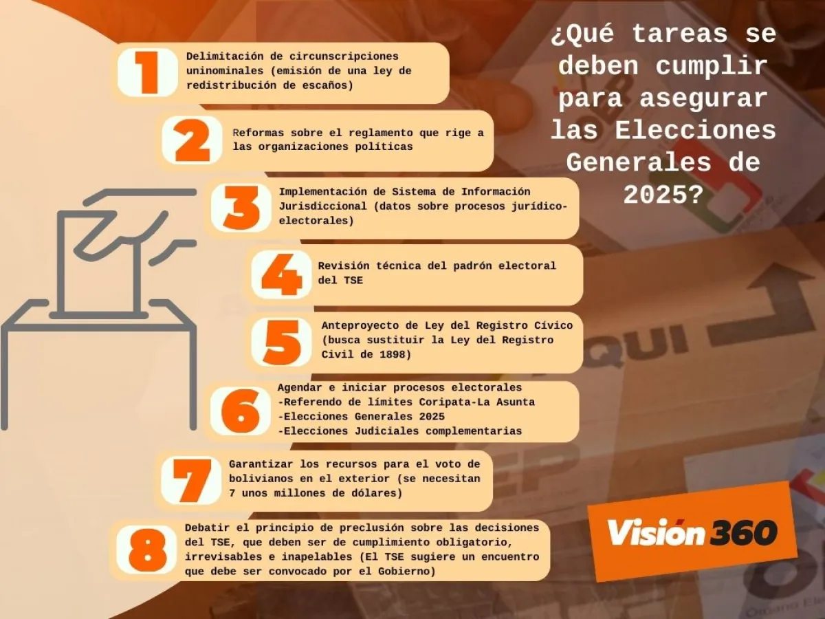 De acuerdo al plan de trabajo del Órgano Electoral, se deben cumplir al menos ocho tareas para lograr que se realicen las Elecciones Generales de 2025, que definirán al presidente del país para los siguientes cinco años. Uno de los principales objetivos es lograr un consenso nacional, para que todas las instancias del Estado y las organizaciones políticas se comprometan a respetar el principio de preclusión y las determinaciones que asuma el ente electoral.