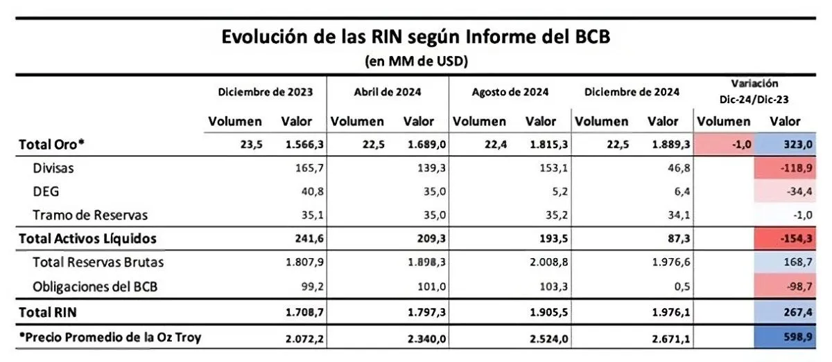 “Las Rin líquidas con las que hemos cerrado la gestión 2024 están próximas a los 50 millones de dólares. Pero si bien las Rin están compuestas por divisas, oro, derechos especiales de giro, todas son líquidas y se pueden emplear para atender las necesidades del sector público”, precisó el presidente del BCB, Edwin Rojas la semana pasada.