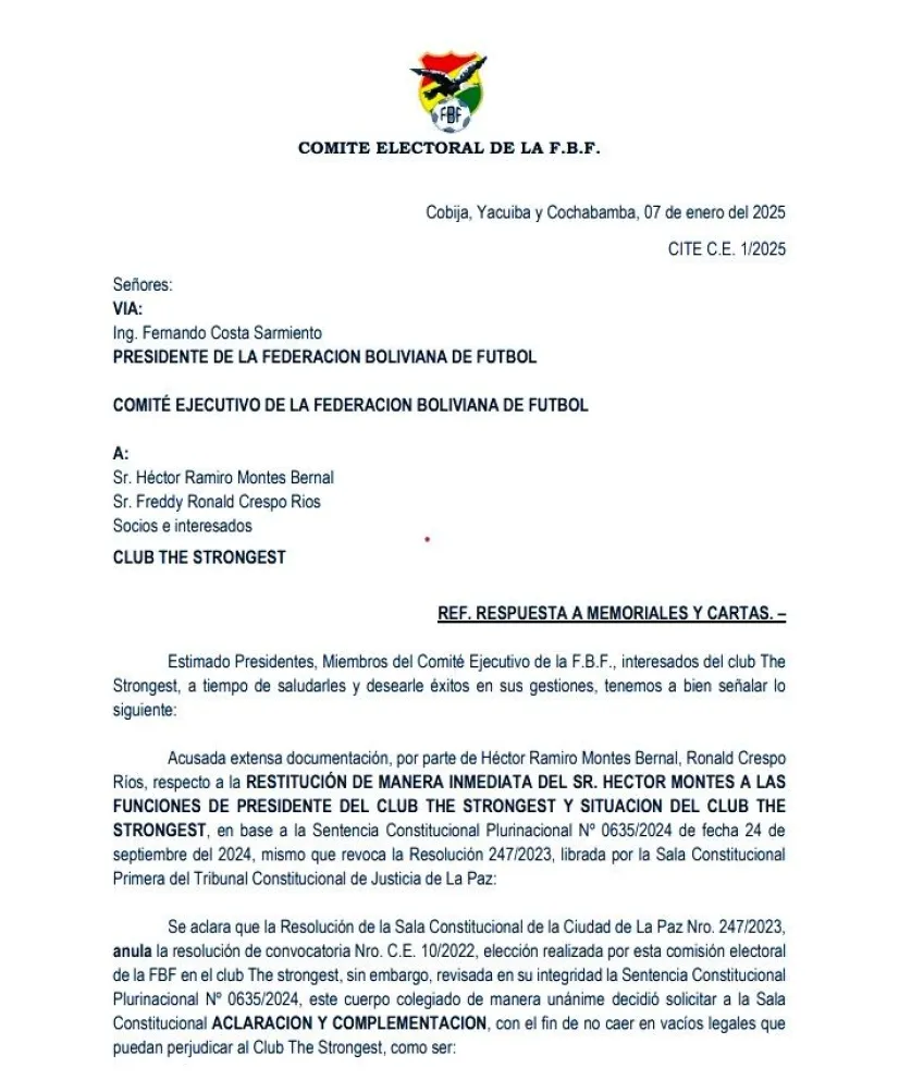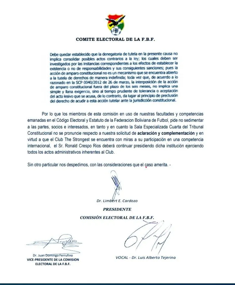 “En virtud a que el club The Strongest se encuentra con miras a su participación en una competencia internacional, el señor Ronald Crespo Ríos deberá continuar presidiendo dicha institución ejerciendo todos los actos administrativos inherentes al club”, señala la nota firmada por Limbert Cardozo, presidente de la Comisión Electoral de la FBF; Juan Ferrufino, vicepresidente; y Luis Tejerina, vocal.