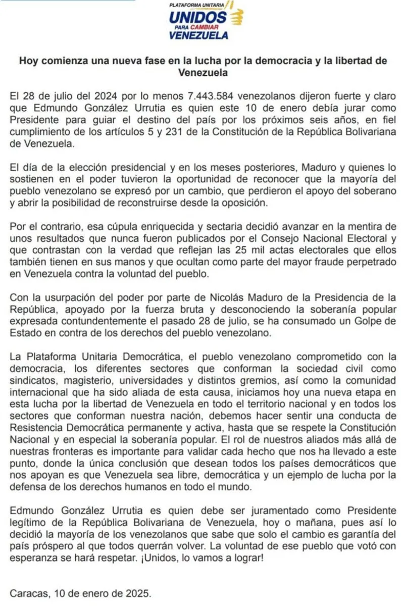 “Edmundo González Urrutia es quien debe ser juramentado como presidente legítimo" dice un pronunciamiento de la Plataforma Unitaria Democrática.