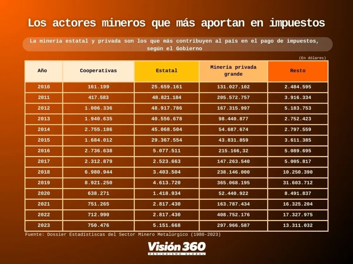El aporte de este sector en 2018 llegó a 238,1 millones de dólares; en 2019, a 365 millones de dólares, y en 2020, por la pandemia y las medidas de confinamientos, disminuyó a 52,4 millones de dólares. Pero su contribución se recuperó a 163,7 millones de dólares en 2021 y en 2022 la recaudación obtenida por el cobro de tributos a estas empresas alcanzó un nivel récord de 408,7 millones de dólares y el año pasado 297,9 millones de dólares, de acuerdo con información del Dossier Minero.