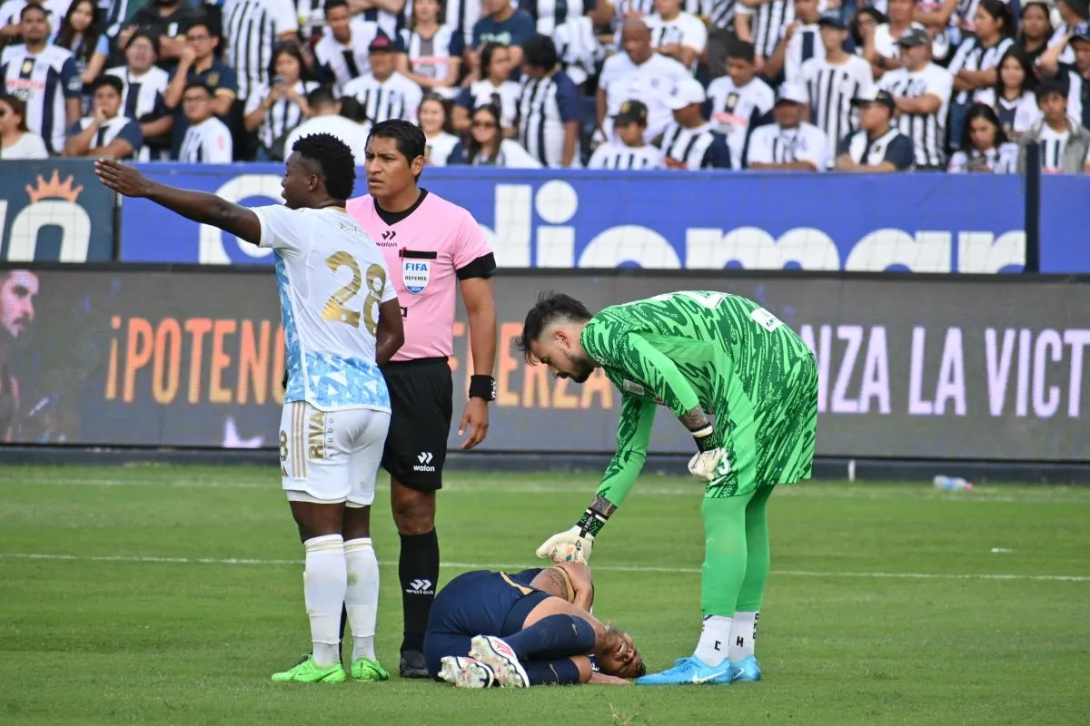 El arquero boliviano Guillermo Viscarra, refuerzo del Alianza Lima, le pega a la pelota en el partido frente a Emelec.