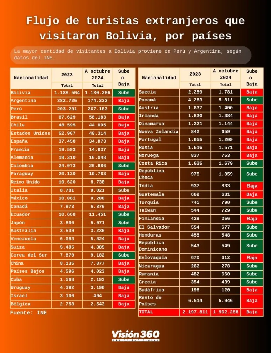 Datos del Ine hasta el mes de octubre revelan que de Perú ingresaron al país 267.183 visitantes internacionales, superior a los  203.201 que arribaron en toda la gestión 2023. Luego está Argentina con 174.232 viajeros (inferior a 2023), Brasil 58. 183 viajeros (inferior a 2023), Chile 44.095 visitantes, Estados Unidos 48.314; España 34.873,  Francia 14.837, Alemania 16.048, Colombia 26.986, Paraguay 19.763, Reino Unido 8.738. (Ver infograma). Destaca el aumento de visitantes de Japón de 3.806 en toda la gestión 2023 a 5.071 visitantes en 10 meses del año pasado o de Corea del Sur de 7.870 en 2023 a 9.182.