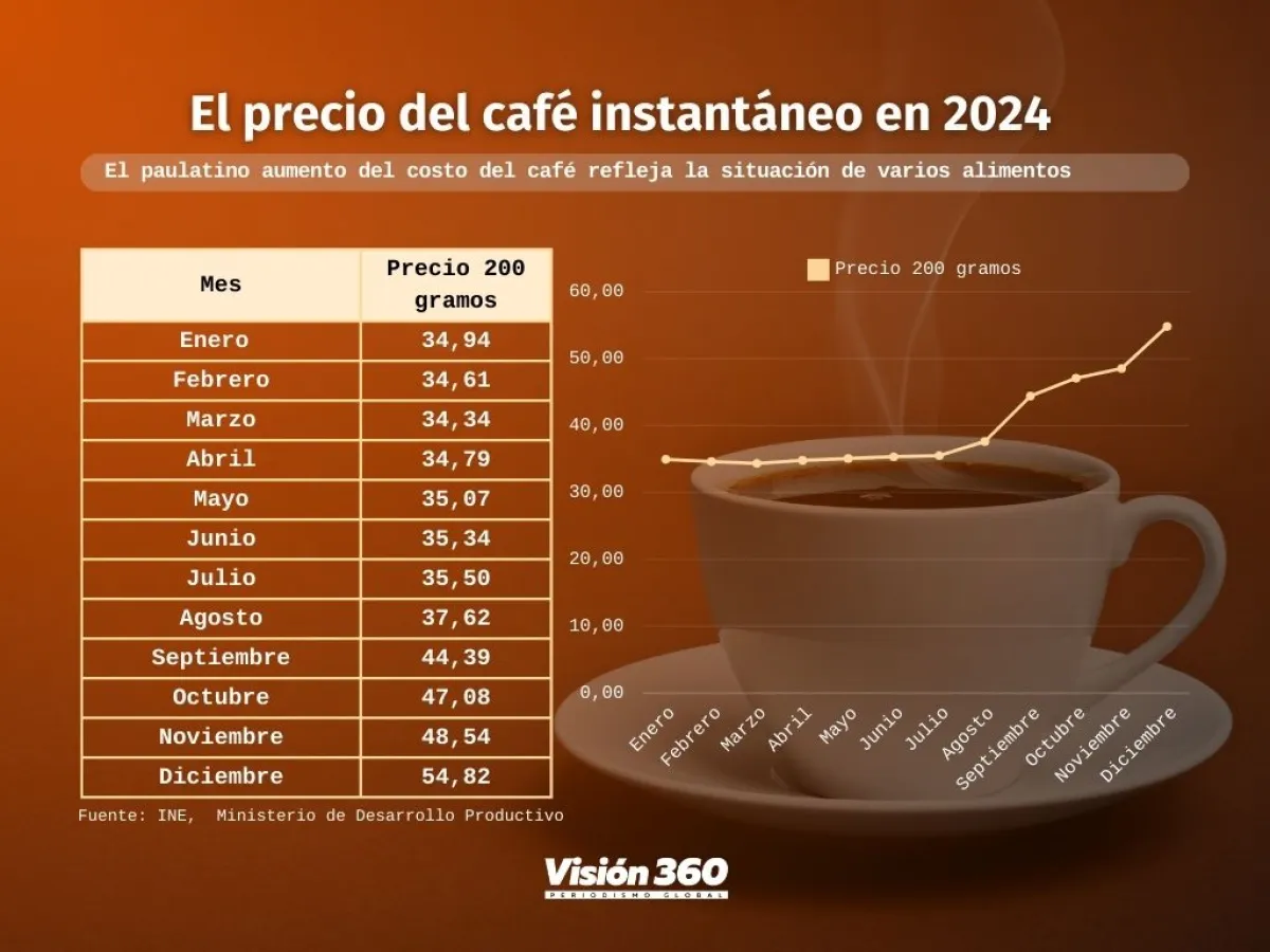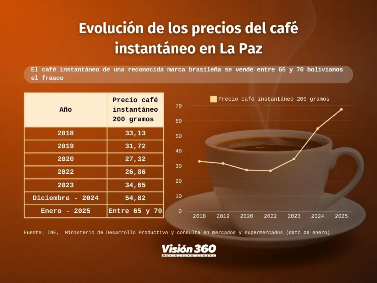 En los centros de abasto el precio comenzó a elevarse en septiembre del año pasado. Datos del Instituto Nacional de Estadística y del Ministerio de Desarrollo Productivo dan cuenta que el café instantáneo de 200 gramos en enero de 2024 costaba 34,94 bolivianos en promedio, en mayo comenzó a subir a 35 y, en agosto, a 37,62. En septiembre su costo se registró en 44,39 bolivianos; en octubre, 47,08; en noviembre fue 48,54 bolivianos, y en diciembre, 54,82.