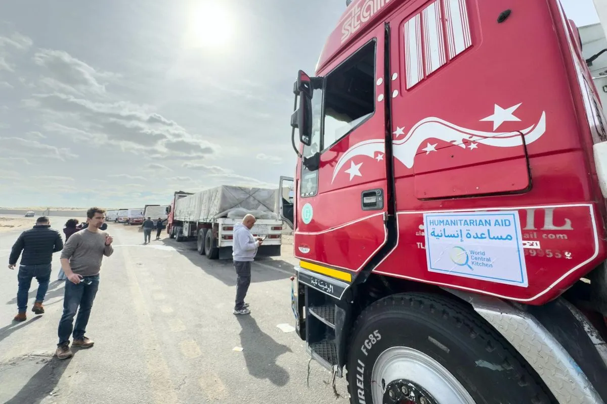 Centenares de camiones con alimentos y productos básicos, incluida agua potable, material sanitario e higiénico y tiendas de campaña, aguardaban desde hace días cerca del cruce a la entrada en vigor del acuerdo de alto el fuego entre Israel y Hamás.
