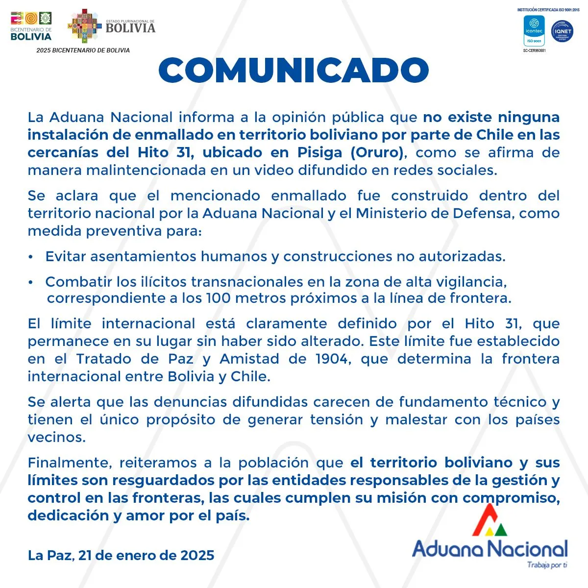 “Se aclara que el mencionado enmallado fue construido dentro del territorio nacional por la Aduana Nacional y el Ministerio de Defensa, como medida preventiva para evitar asentamientos humanos y construcciones no autorizadas, combatir los ilícitos transnacionales en la zona de alta vigilancia, correspondiente a los 100 metros próximos a la línea de frontera”, se lee en un comunicado de la Aduana.